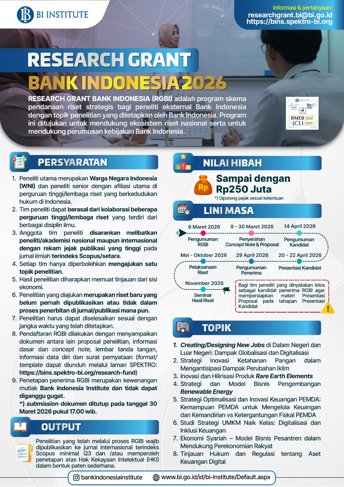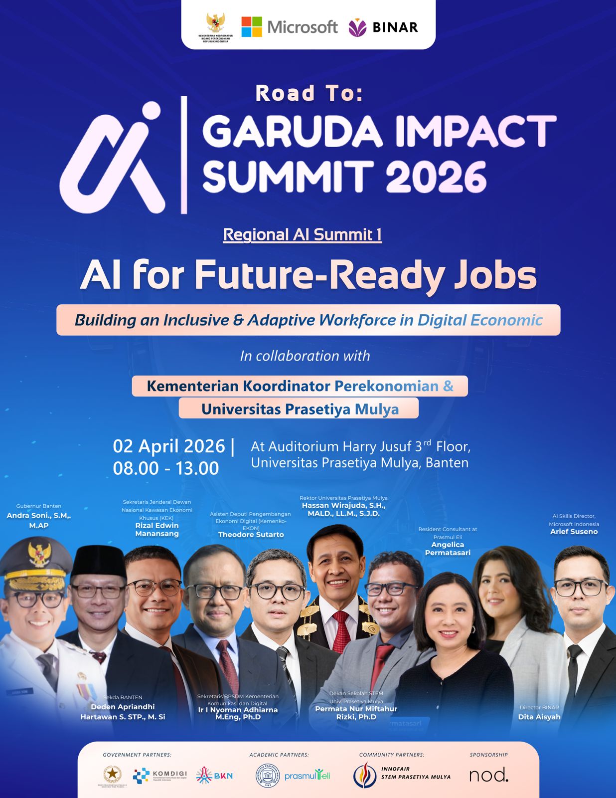 Dalam rangka pelaksanaan GARUDA AI Impact Summit Banten, dibuka kesempatan bagi dosen Universitas Prasetiya Mulya untuk berperan sebagai Fasilitator Working Group dalam forum kebijakan strategis yang mempertemukan para pemimpin pemerintahan daerah Provinsi Banten.
