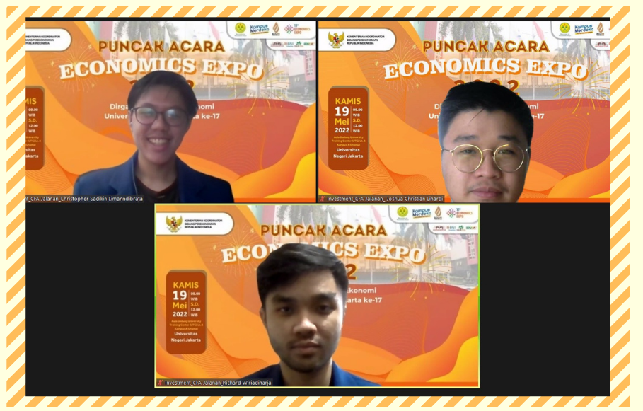 Universitas Negeri Jakarta organized the 2022 International Stock Portfolio Analysis Competition which theme was “Sharpening Young Investors Analysis Skill on Building Stock Portfolio”. This is an international for diploma and undergraduate students. The participants must form a team of three students. Universitas Prasetiya Mulya was represented by Christopher Sadikin Limandibrata (Finance & Banking 2019), Joshua Christian Linardi (Finance & Banking 2019), and Richard Wiriadiharja (Finance & Banking 2019). There were two rounds in this competition. The first round required each team to build a portfolio consisting of 5 stocks from Indonesia Stock Exchange (IDX). They observed their portfolio growth for 14 days. Afterward, they created the report about the investment strategy and analyzed industries and companies. Our team proceeded to the next round because of their team’s strategies and stock selection. In the final round, our team presented their report to a panel of expert judges. There were 10 teams as the finalists. Our team competed against teams from Universitas Indonesia, Universitas Malaysia Sabah, Halu Oleo University, Tunku Abdul Rahman University College, and other reputable universities. After two months of competing, Christopher, Joshua, and Richard won 2nd Place. Let’s congratulate them!