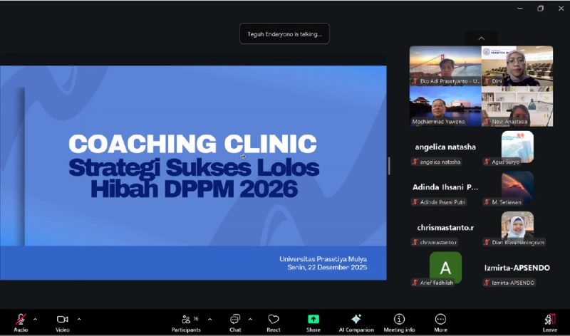 Kegiatan Coaching Clinic ini dilengkapi dengan sesi tanya jawab dan pembahasan proposal, yang memberi ruang bagi peserta untuk mengklarifikasi berbagai kendala yang dihadapi dalam penyusunan proposal. Melalui kegiatan ini, LPPM Universitas Prasetiya Mulya berharap dosen semakin siap mengajukan proposal yang berkualitas, kompetitif, dan berpeluang besar lolos pendanaan pada tahun mendatang.