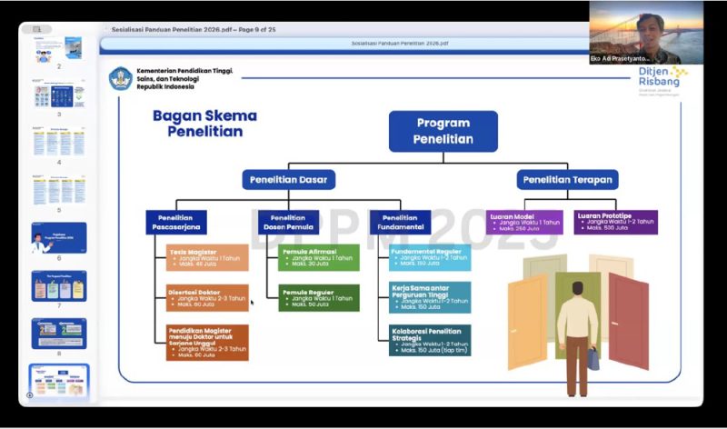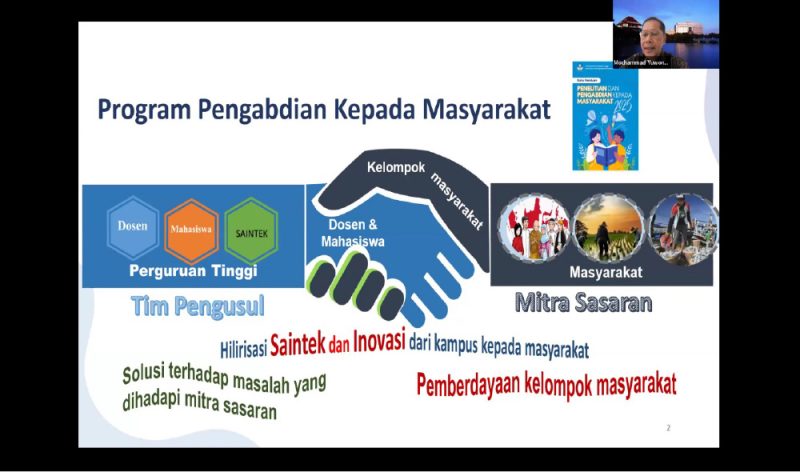 Dalam penjelasannya, pengabdian kepada masyarakat tidak hanya berfokus pada pemberian pelatihan atau bantuan alat, tetapi harus mampu menghadirkan solusi yang komprehensif, bermakna, dan berkelanjutan. Permasalahan mitra idealnya mencakup lebih dari satu aspek, seperti produksi, manajemen, dan pemasaran, dengan luaran yang terukur. Ia juga mengingatkan pentingnya kesesuaian rencana anggaran biaya, khususnya ketentuan bahwa sebagian besar dana dialokasikan untuk teknologi atau sarana yang secara langsung diserahkan kepada mitra.