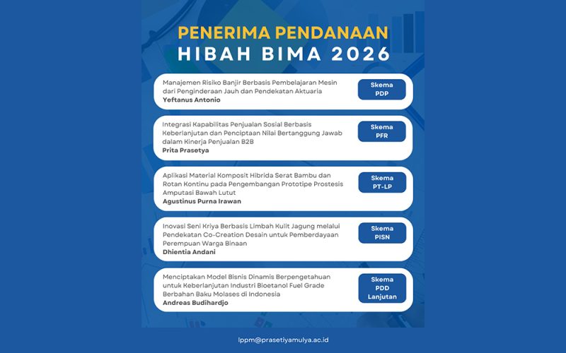Universitas Prasetiya Mulya kembali mencatatkan capaian membanggakan melalui keberhasilan sejumlah dosen dalam memperoleh pendanaan Hibah BIMA 2026 yang berasal dari DPPM Kemendiktisaintek. Pendanaan ini diberikan untuk mendukung pelaksanaan penelitian dan pengabdian kepada masyarakat yang berfokus pada pengembangan ilmu pengetahuan sekaligus memberikan kontribusi nyata terhadap kebutuhan industri dan masyarakat.