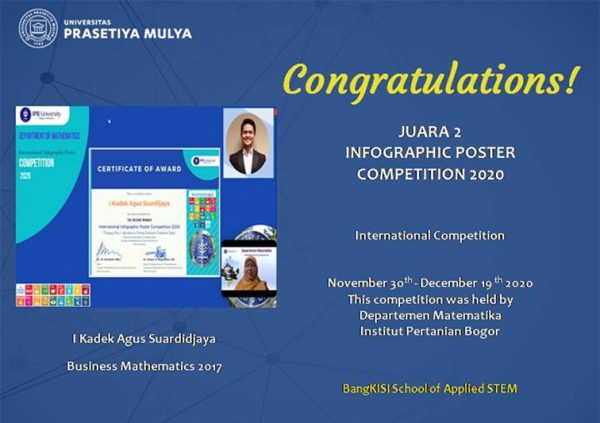 Mahasiswa Business Mathematics berhasil meraih juara 2 di ajang Infographic Poster Competition merupakan kompetisi yang diselenggarakan oleh Departemen Matematika Institut Pertanian Bogor dengan tema “Managing Risk in Agriculture to Promote Sustainable Development Goals”.