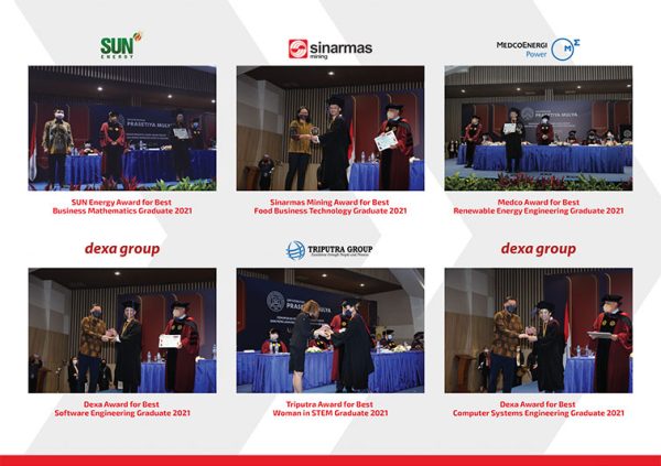 Dalam kegiatan wisuda kali ini, Sekolah STEM secara khusus memberikan apresiasi STEM Graduate Award kepada mahasiswa lulusan terbaik masing-masing program studi dan juga lulusan terbaik perempuan di STEM Prasetiya Mulya. STEM Graduate Award 2021 merupakan hasil kolaborasi antara Sekolah STEM dengan perusahaan sponsor yaitu SUN Energy, Dexa Group, Medco Power Indonesia, Sinarmas Mining, dan Triputra Group. Berikut adalah daftar peraih STEM Graduate Award tahun 2021: