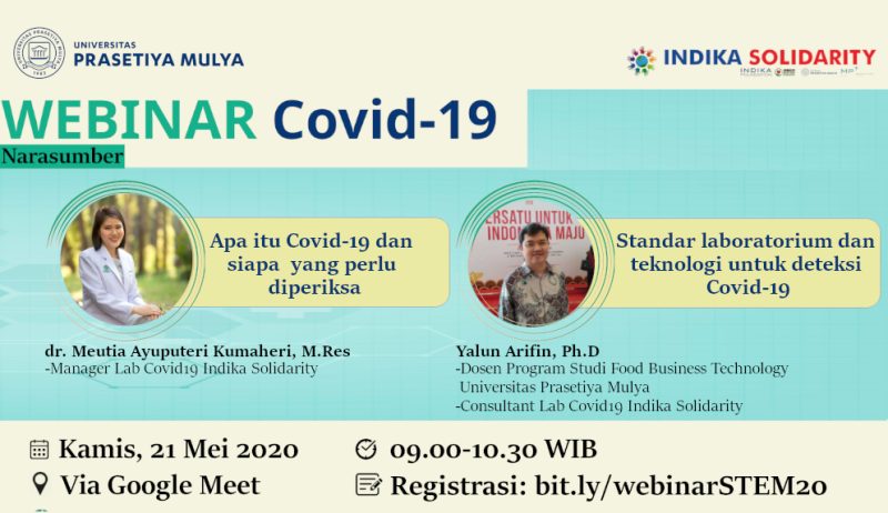 Pada Kamis 21 Mei 2020 Universitas Prasetiya Mulya dan Indika Solidarity mengadakan Webinar dengan tema Covid-19 yang dibawakan oleh dua narasumber yaitu Ibu dr.Meutia Ayuputeri Kumaheri, M.Res (Manager Lab Covid19 Indika Solidarity) dengn topik “Apa itu Covid-19 dan siapa yang perlu diperiksa” dan Bapak Yalun Arifin, Ph.D (Dosen Program Studi Food Business Technology dan consultant Lab Covid19 Indika Solidarity) yang membawakan topik “Standar Laboratorium dan teknologi untuk deteksi Covid-19”.
